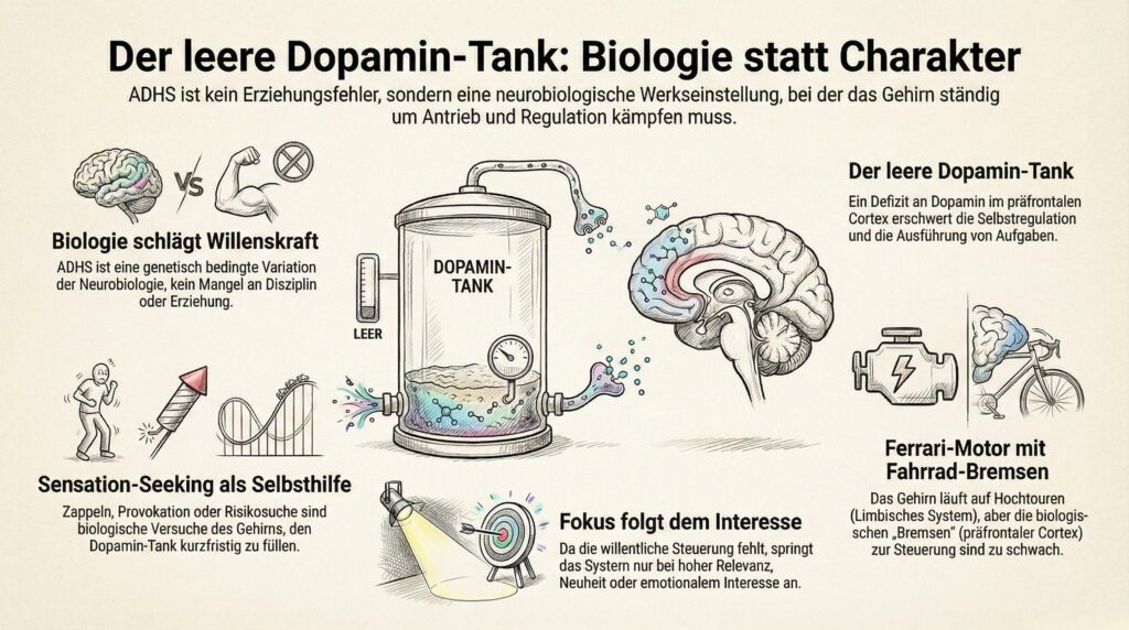 Man kann sich das Gehirn wie ein System mit einem „leeren Dopamin-Tank“ vorstellen. Ohne ausreichende chemische Aktivierung fehlt der biologische Startimpuls. Um diesen Tank zu füllen und das System „wachzuschalten“, nutzen Betroffene instinktiv verschiedene Verhaltensweisen: